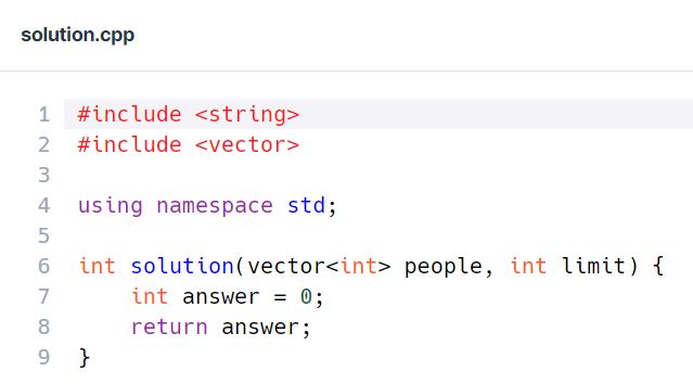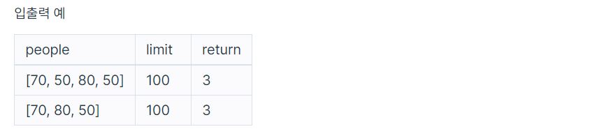 모든 사람을 구출하기 위해 필요한 구명보트 개수의 최솟값을 리턴하는 것이 목표이다.
