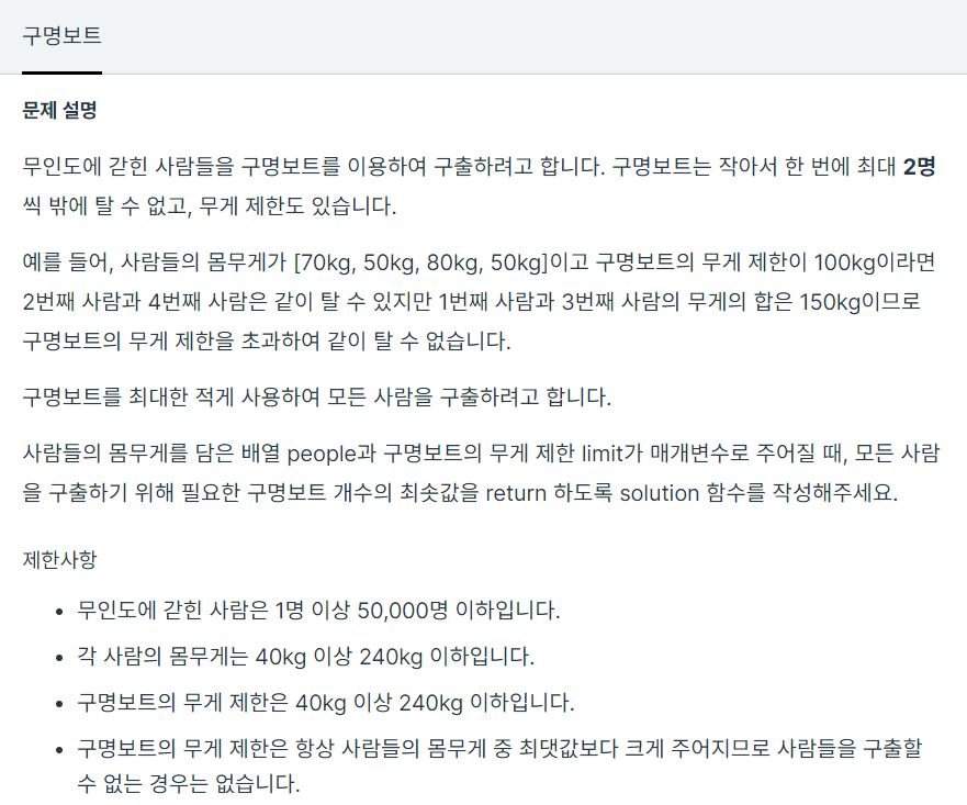 사람들의 몸무게(people)는 [70, 50, 80, 50], 구명보트의 무게제한(limit)은 100이다.