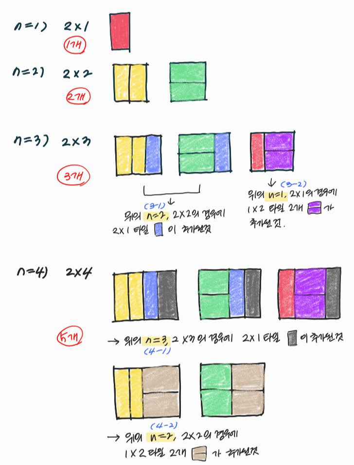 (n-2)번째 경우의 수에서는 2×1 타일들 2개를 이용해 2×n 타일을 만들 수 있었다.