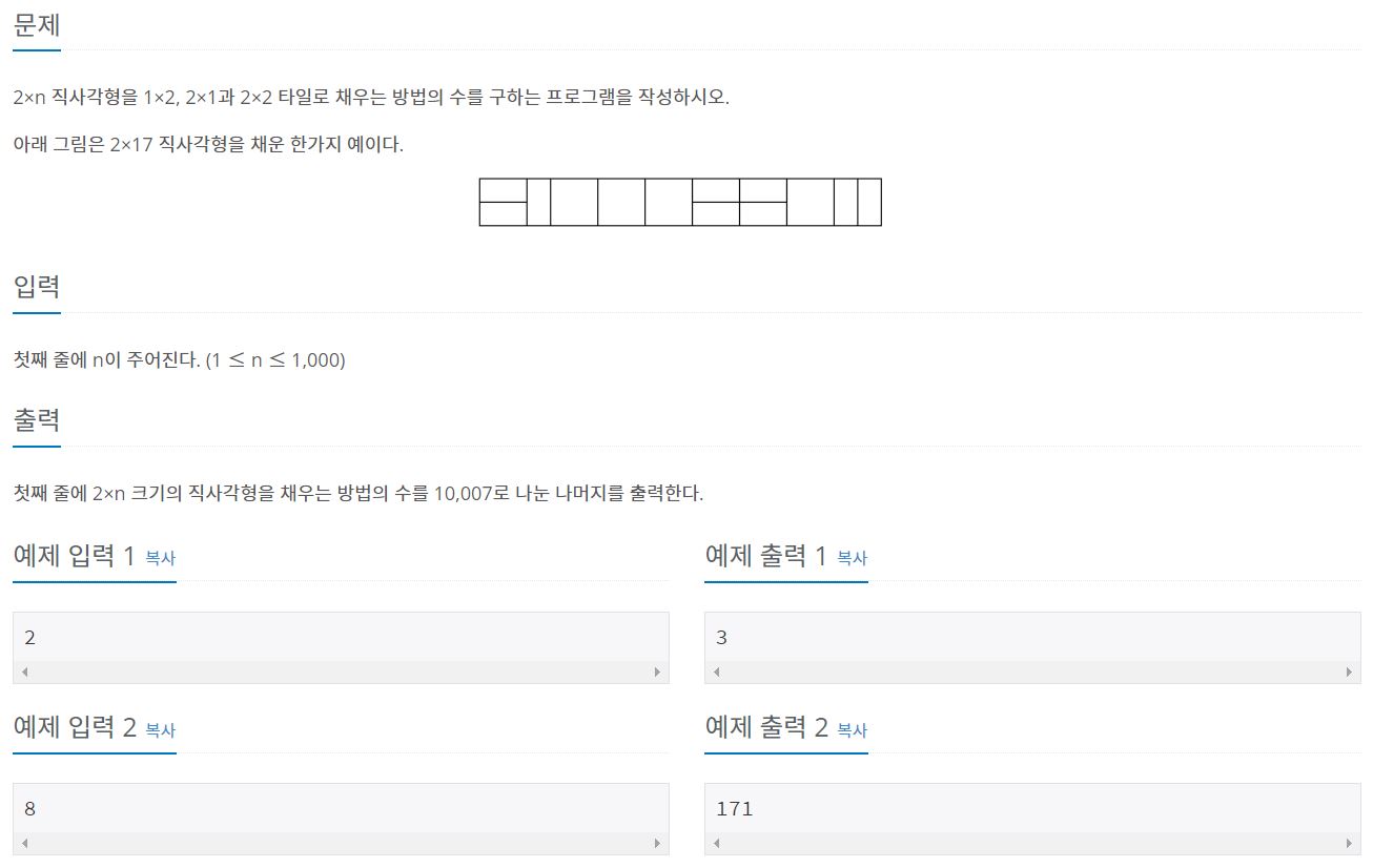1×2, 2×1, 2×2 타일로 채우는 방법의 수를 구하는 것이 목표이다.