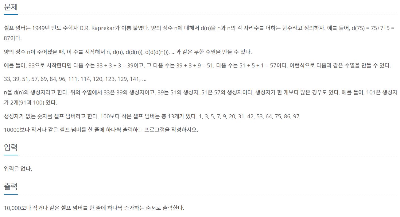 10000보다 작거나 같은 셀프 넘버를 한 줄에 하나씩 출력하는 프로그램을 작성하는 것이 목표이다.