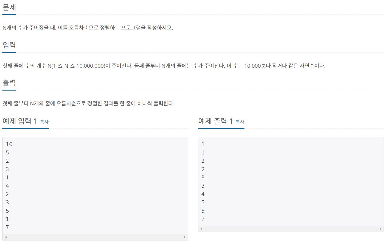 비슷한 문제로는 2750번 수 정렬하기, 2751번 수 정렬하기2 가 있다.