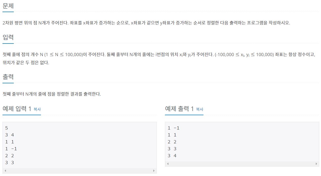 2차원 평면 좌표를 x좌표 순으로 정렬하되, x좌표가 같다면 y좌표 순으로 정렬하는 것이 목표이다.