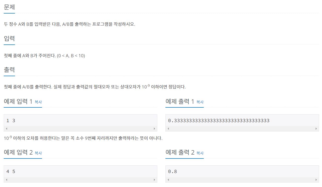 두 정수 A와 B를 입력받은 다음, A/B를 출력하는 프로그램을 작성하시오.