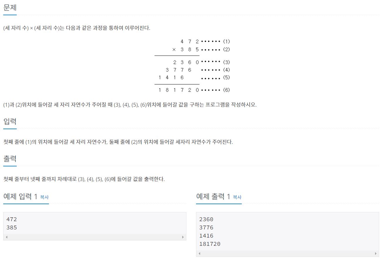해당 자릿수와 (1)의 곱을 출력, 마지막으로 (1)과 (2)의 곱을 출력해주면 된다.