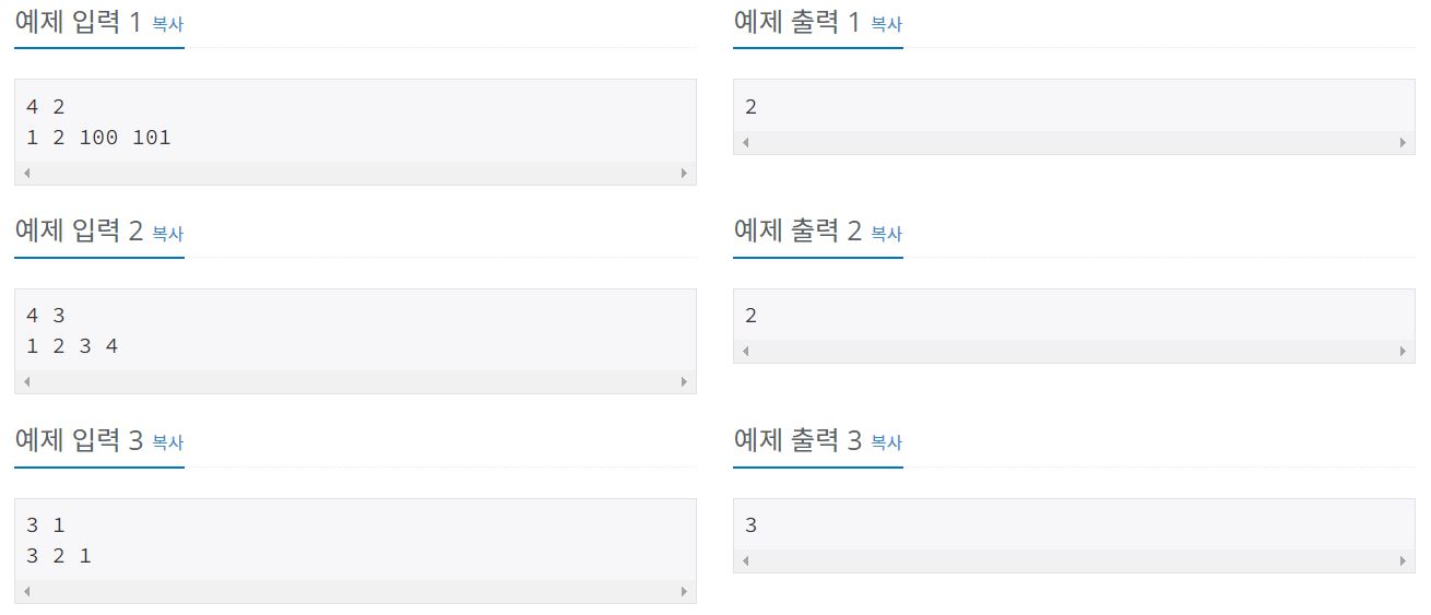 첫째 줄에 물이 새는 곳의 개수 N과 테이프의 길이 L이 주어진다. 둘째 줄에는 물이 새는 곳의 위치가 주어진다. N과 L은 1,000보다 작거나 같은 자연수이고, 물이 새는 곳의 위치는 1,000보다 작거나