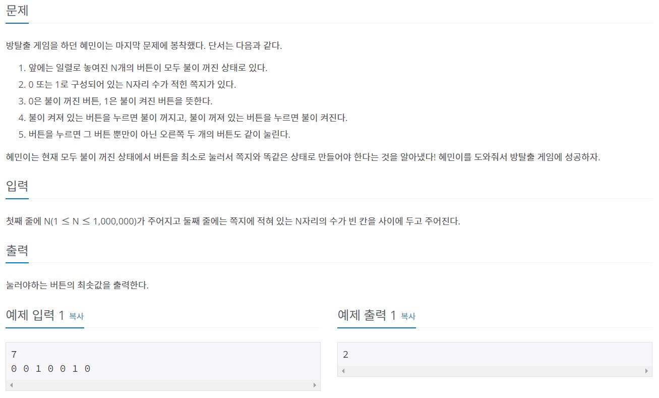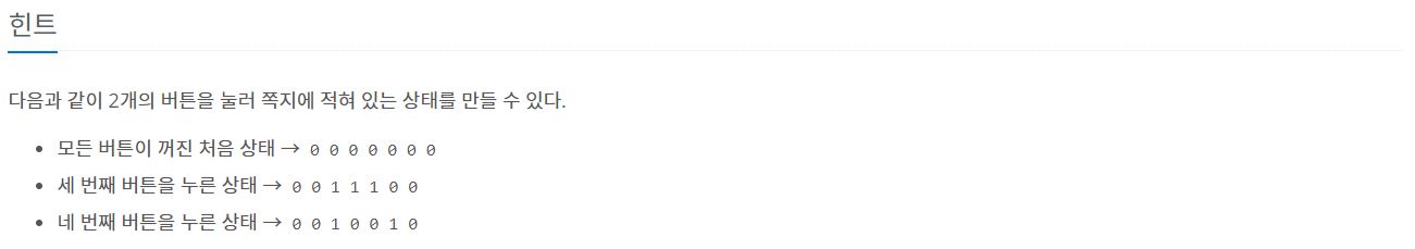 혜민이는 모두 불이 꺼진 상태에서 버튼을 최소로 눌러, 쪽지와 똑같은 상태로 만들려고 한다.