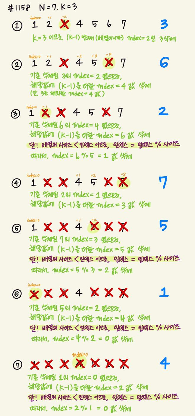 이런식으로 기존 index 값에 (K - 1) 값을 더해나가며 삭제해주면 된다.