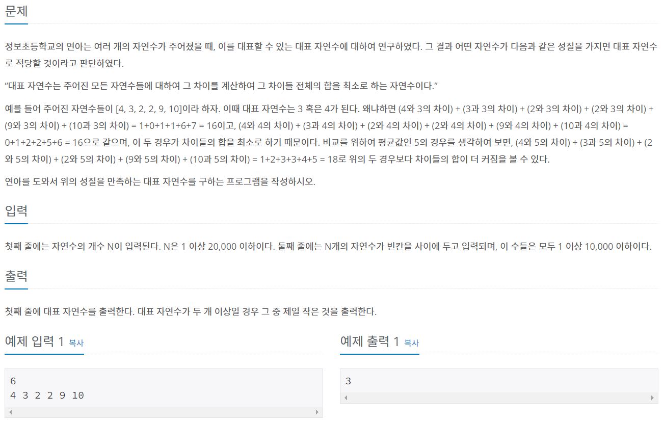 (단, N이 짝수일 경우 중앙값이 2개 나오게 되는데, 이 중 작은 값을 대표 자연수로 채택한다.)