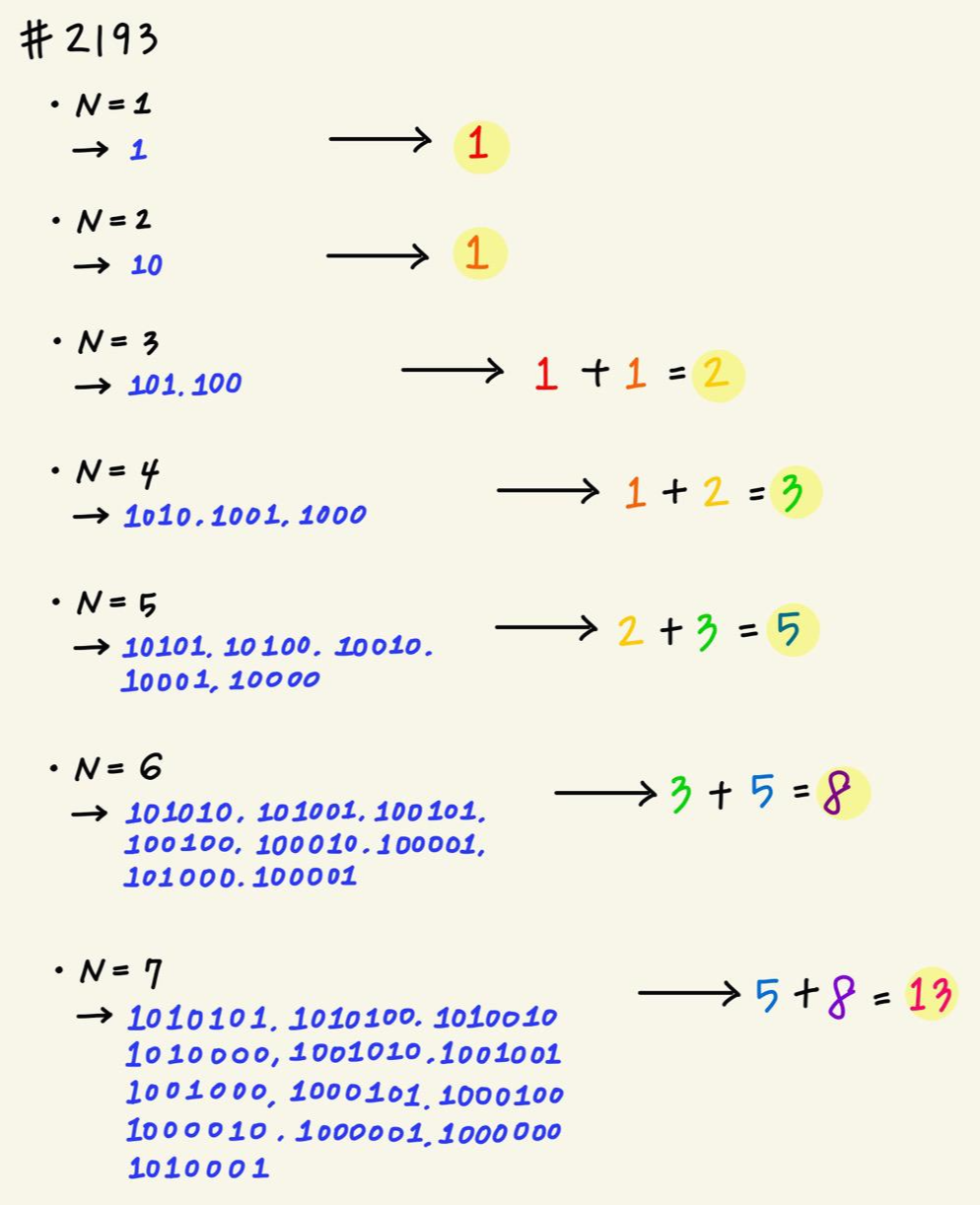 위 그림은 N = 1 ~ 7 까지 구할 수 있는 모든 이친수의 경우이다.