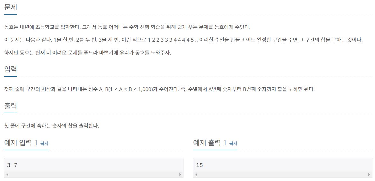 위와 같이 자연수 n 이 n 번 나타나는 형태의 수열에서, 주어진 구간의 합을 구하는 문제이다.