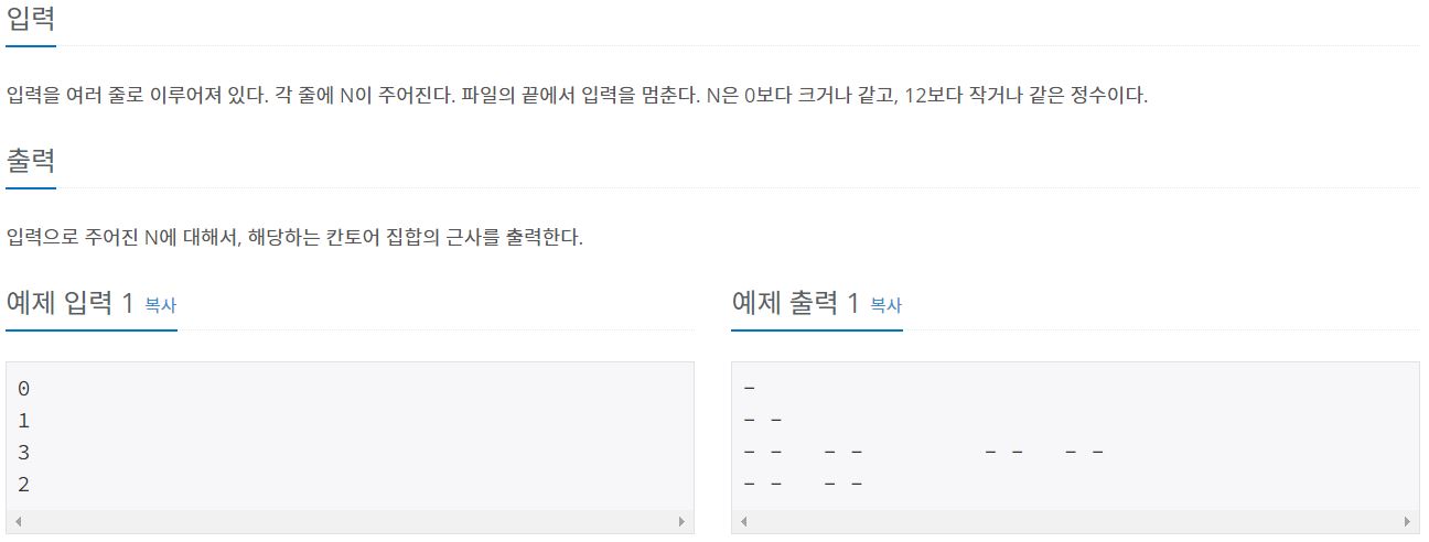 N이 주어졌을 때, 칸토어 집합 규칙에 따른 결과를 출력하는 문제이다.