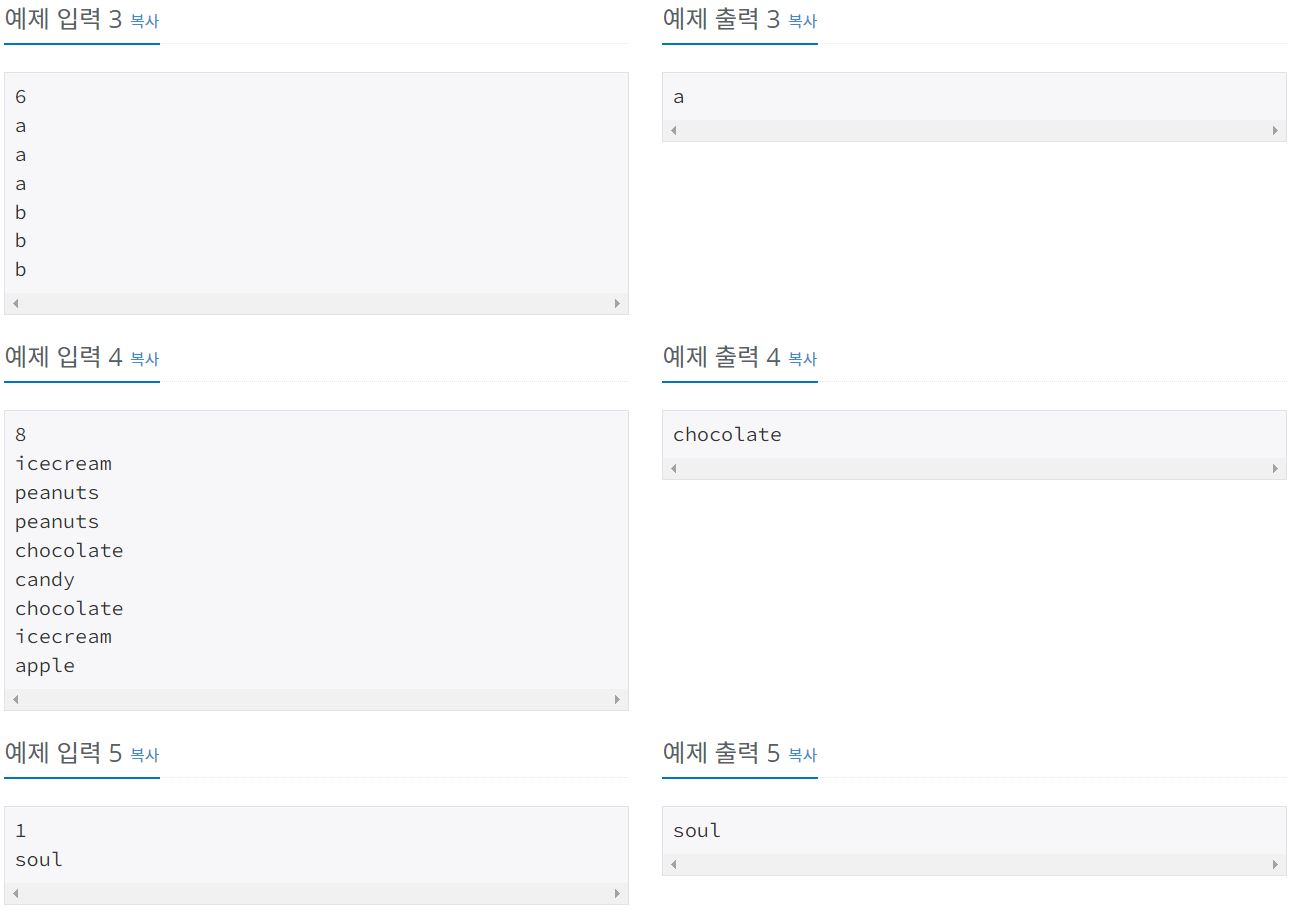 첫째 줄에 오늘 하루 동안 팔린 책의 개수 N이 주어진다. 이 값은 1,000보다 작거나 같은 자연수이다. 둘째부터 N개의 줄에 책의 제목이 입력으로 들어온다. 책의 제목의 길이는 50보다 작거나 같고
