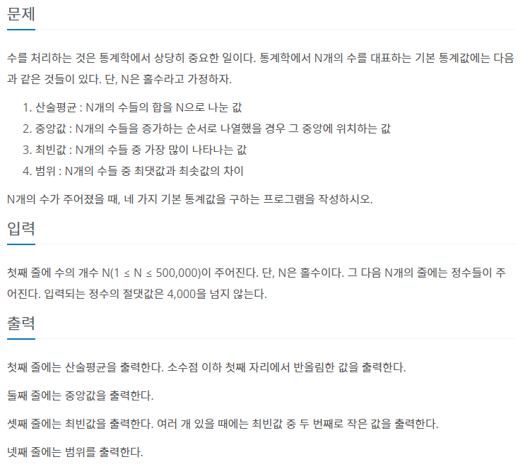 N개의 수가 주어졌을 때, 위와 같은 네 가지 기본 통계값을 구하는 것이 목표이다.