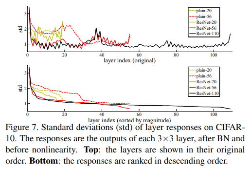 ResNet 20, 56, 110을 비교해보면, 더 깊은 ResNet이 더 작은 response를 가진다는 것 또한 알 수 있다.