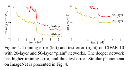 Figure 1. 은 각각 20-Layer와 56-Layer의 training error와 test error를 나타낸 그림이다.