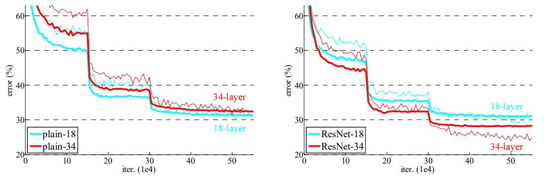 기존의 Plain Networks는 깊이가 깊어질수록 더 높은 train error가 나타난다.