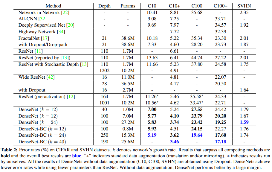 본 논문에서 소개한 DenseNet은 기준으로 삼은 다른 알고리즘들보다 더 놀라운 성과를 보였다.