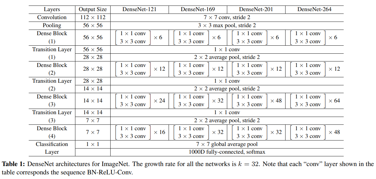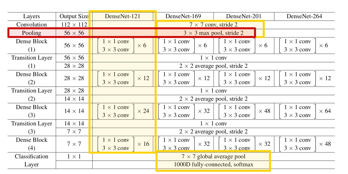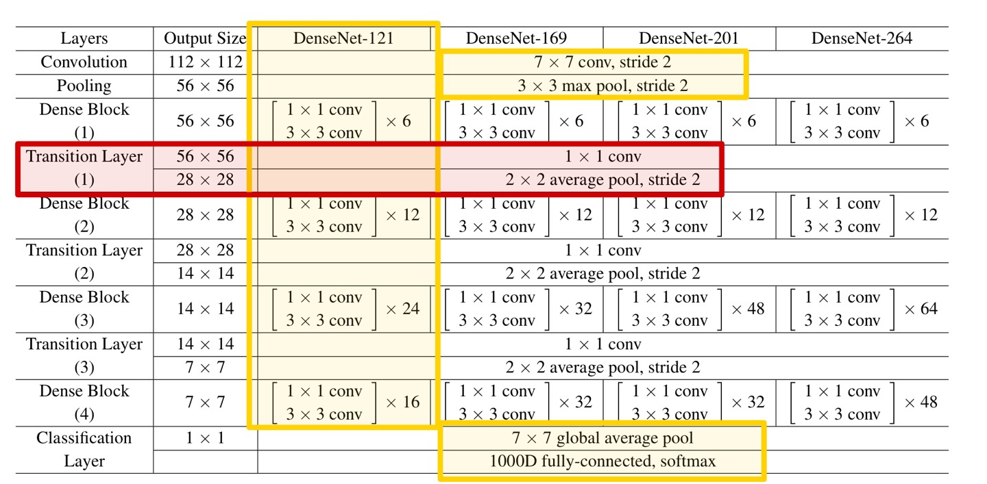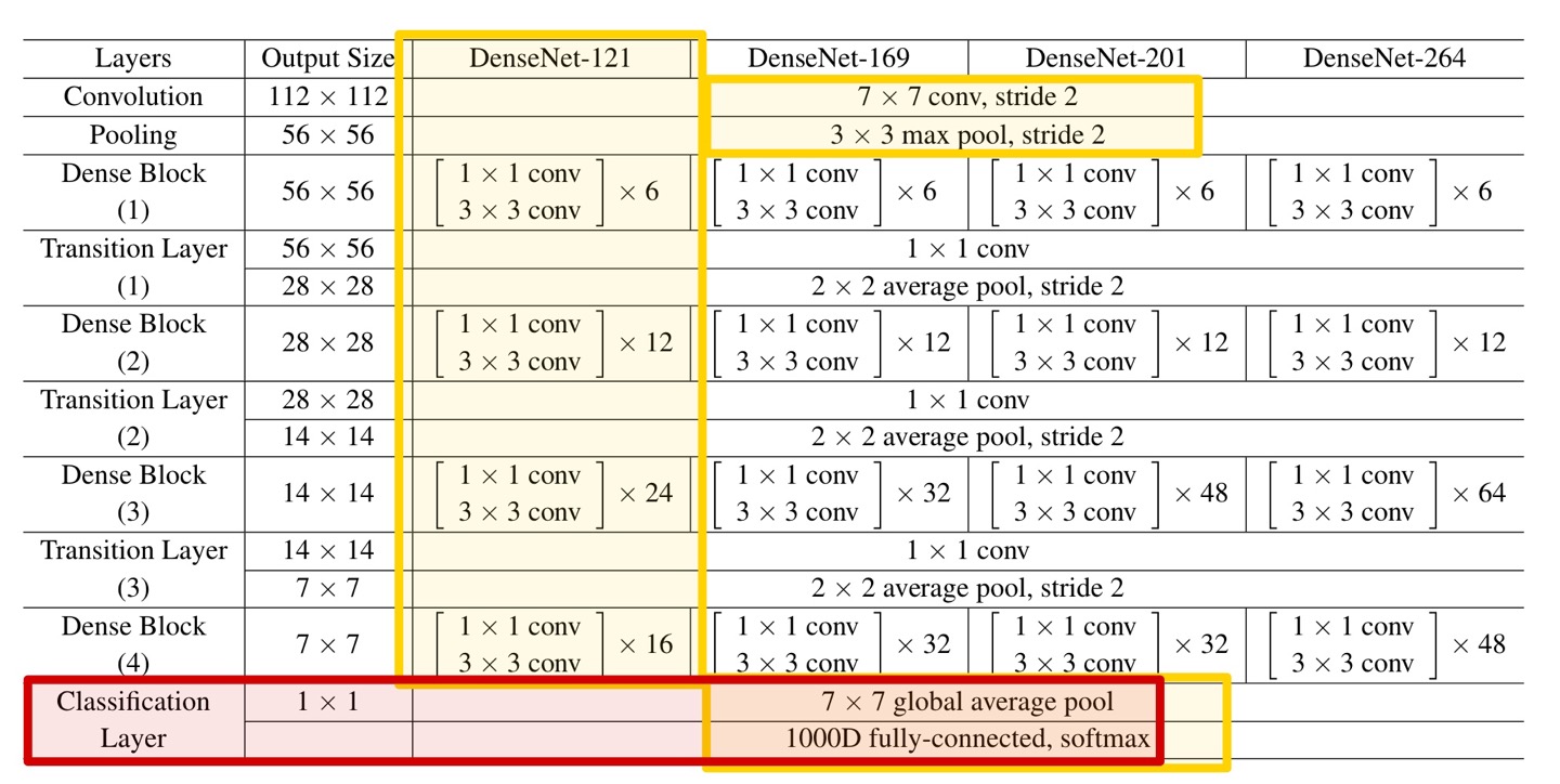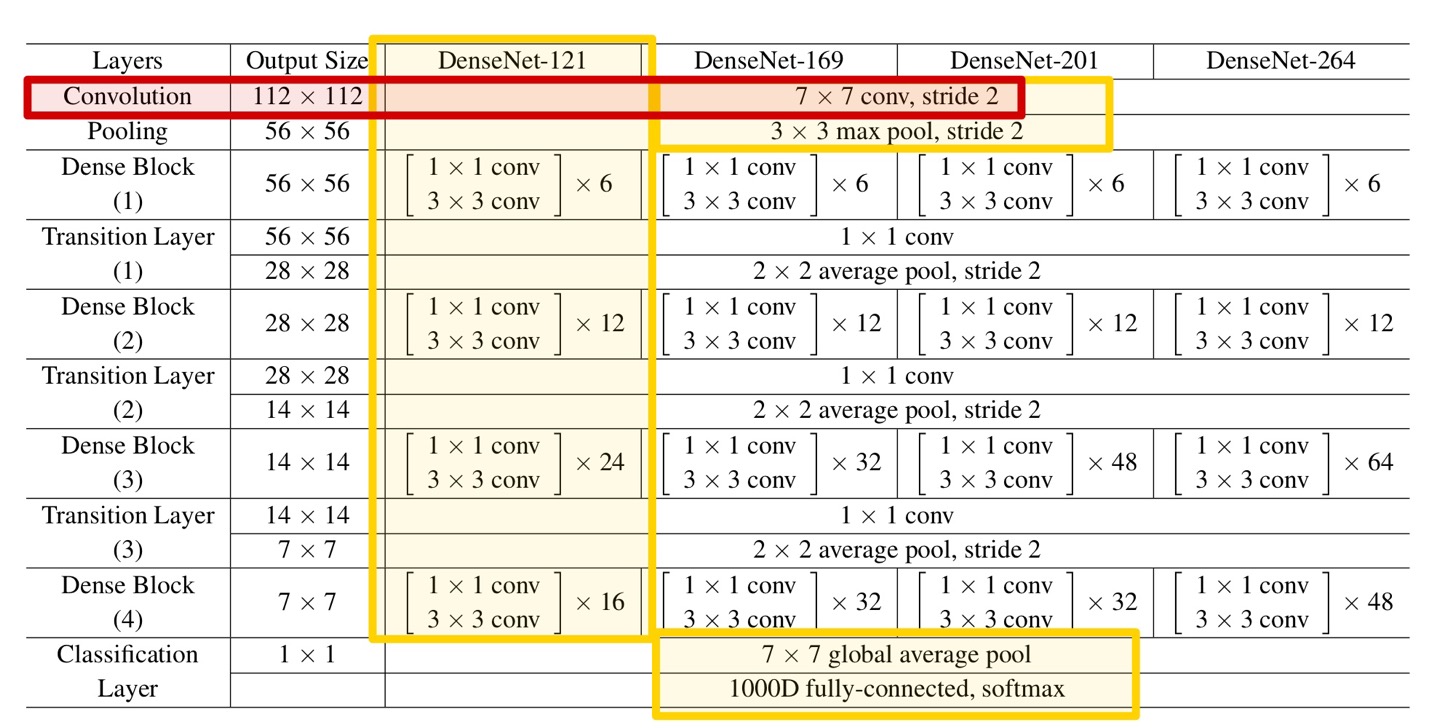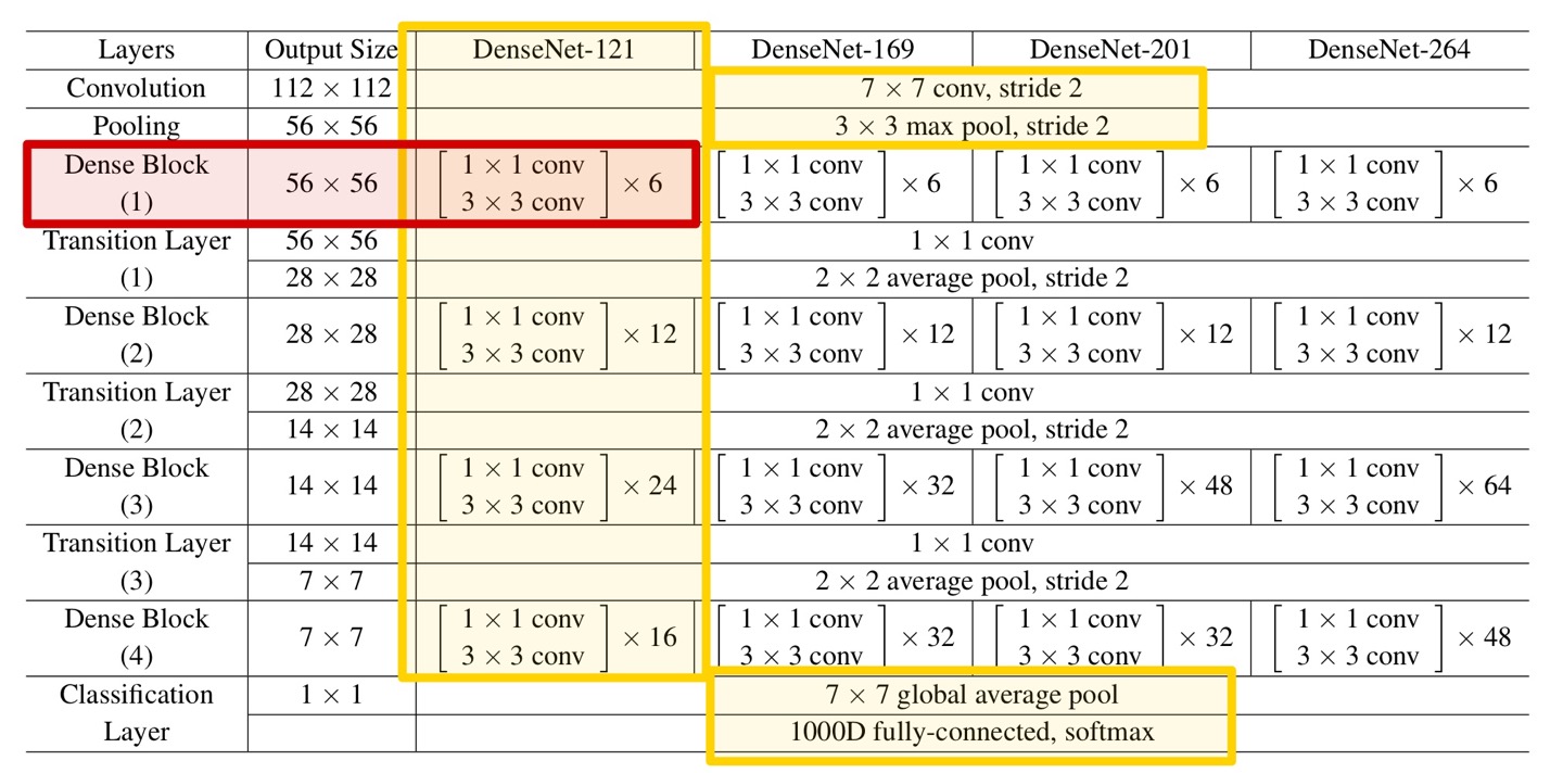 먼저 다시 DenseNet-121의 구조를 보면 아래 Table과 같다.