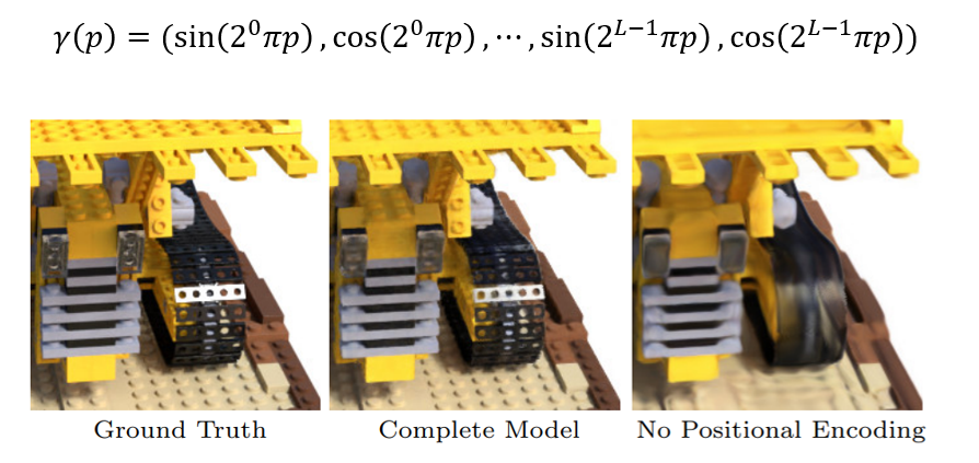 Positional encoding은 NeRF의 네트워크가 high frequency(detail) 영역까지 학습할 수 있도록 하는 기법입니다.