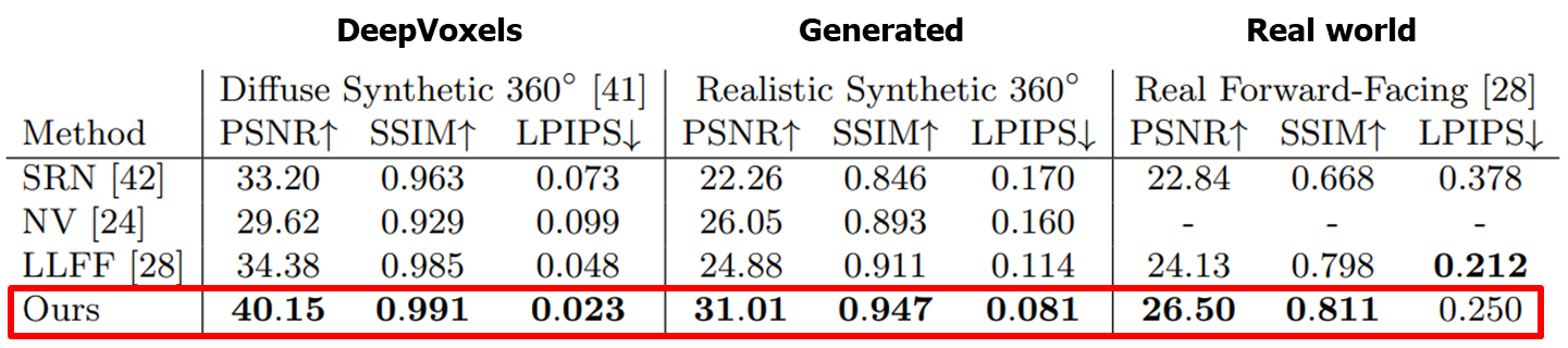 아래 표와 같이 거의 모든 데이터셋과 평가 지표에서 NeRF가 기존의 방법들보다 우수한 성능을 보였으며,
