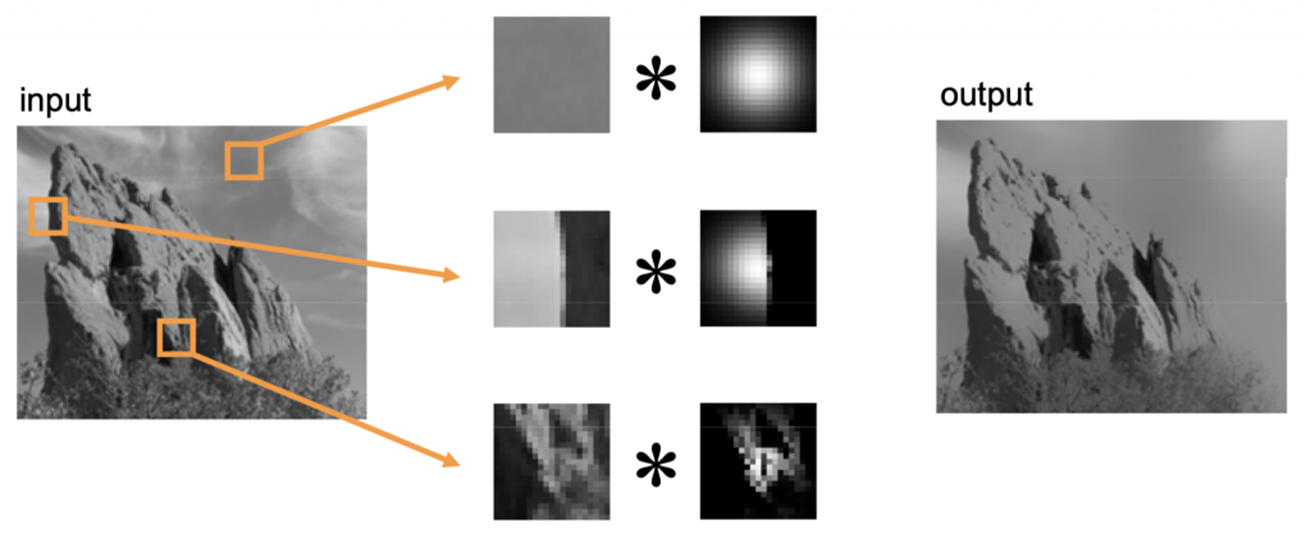 Bilateral filter는 아래와 같이 이미지 패치의 특성을 고려하여 커널의 모양을 달리해 필터링하는 방법입니다.