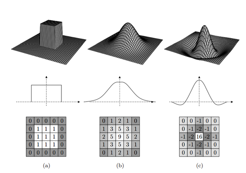 다음 (b)와 (c)는 Gaussian filter의 일종으로, 이미지를 부드럽게 하거나 노이즈를 줄이는 데 사용됩니다.