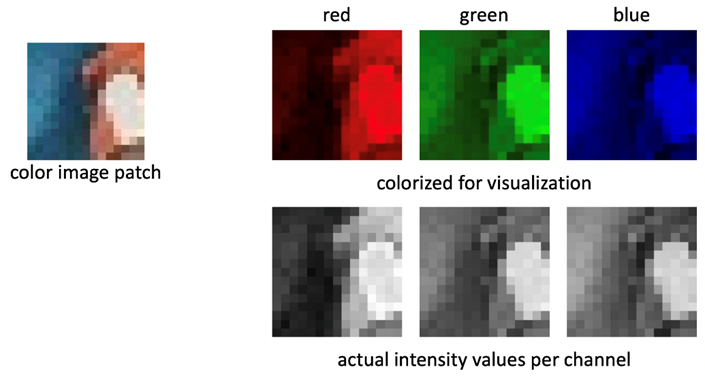 각 픽셀은 RGB 값으로 색상을 나타내며 각 색상의 강도(intensity)를 나타냅니다.