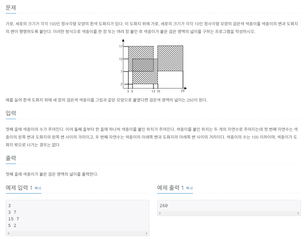 가로, 세로의 크기가 각각 100인 정사각형 모양의 도화지가 존재한다. 이 도화지 위에 가로, 세로의 크기가 각각 10인 정사각형 모양의 검은색 색종이를 색종이의 변과 도화지의 변이 평행하도록 붙인다. 이러한 방식으로 색종이를 한 장 또는 여러 장 붙인 후 색종이가 붙은 검은 영역의 넓이를 구하는 것이 목표이다.