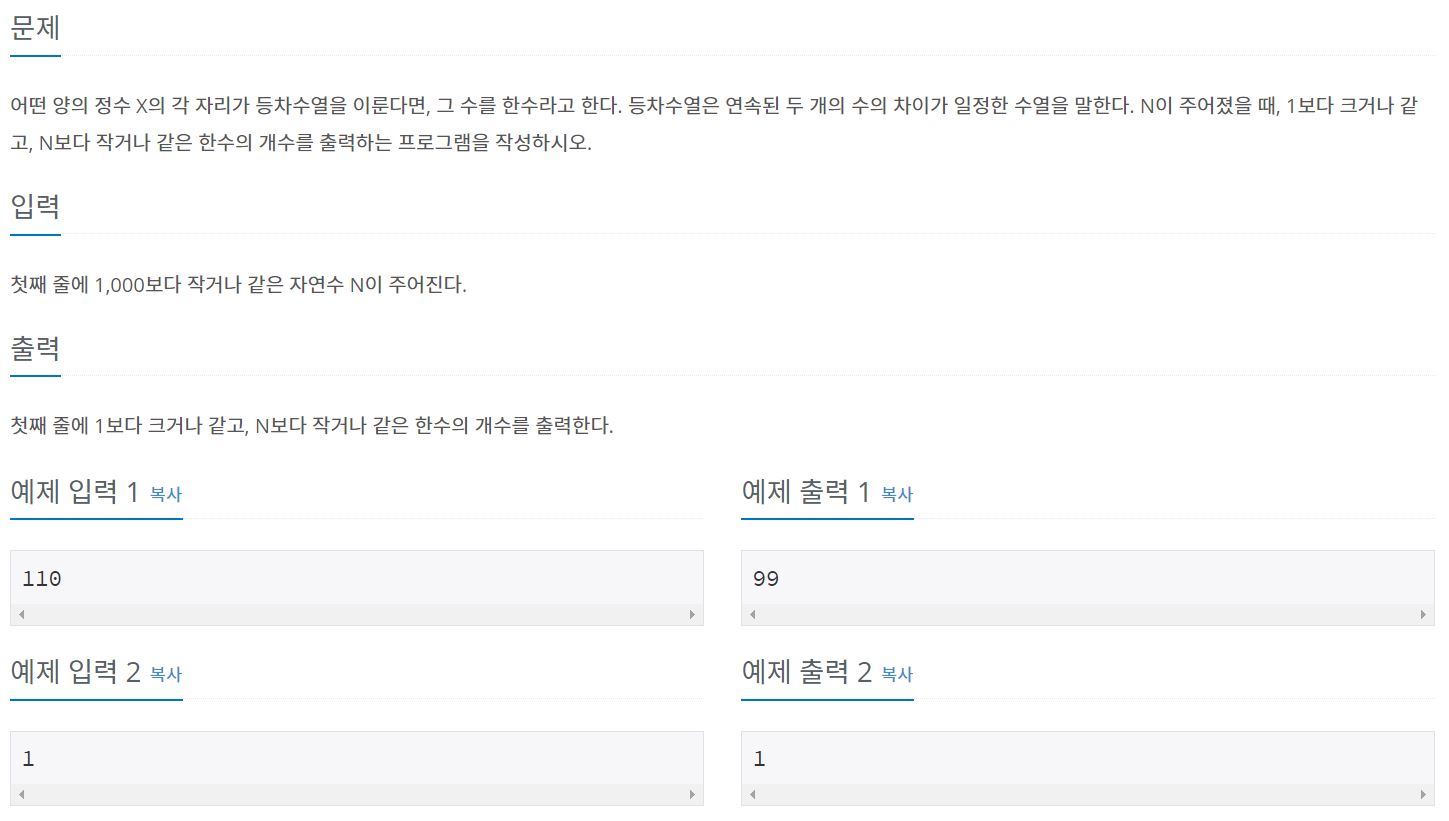 1부터 입력받은 N까지의 자연수 중 한수의 개수를 출력하는 문제이다. (N은 1000이하의 자연수이다.)