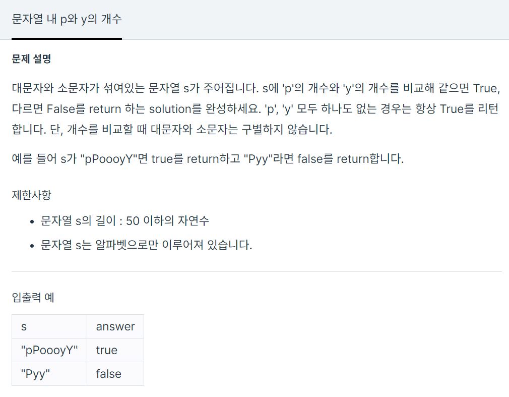 코딩테스트 연습 - 문자열 내 p와 y의 개수 | 프로그래머스 (programmers.co.kr)