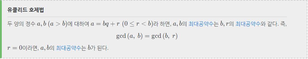 유클리드 호제법을 이용하면 금방 구현할 수 있는 알고리즘이었다.