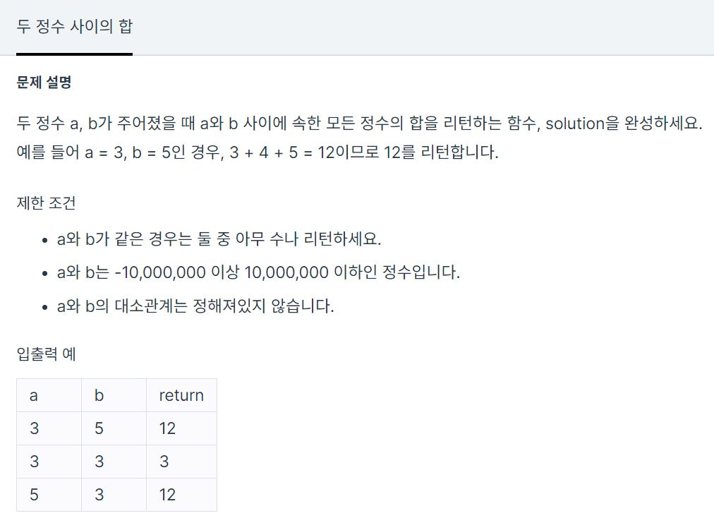 코딩테스트 연습 - 두 정수 사이의 합 | 프로그래머스 (programmers.co.kr)