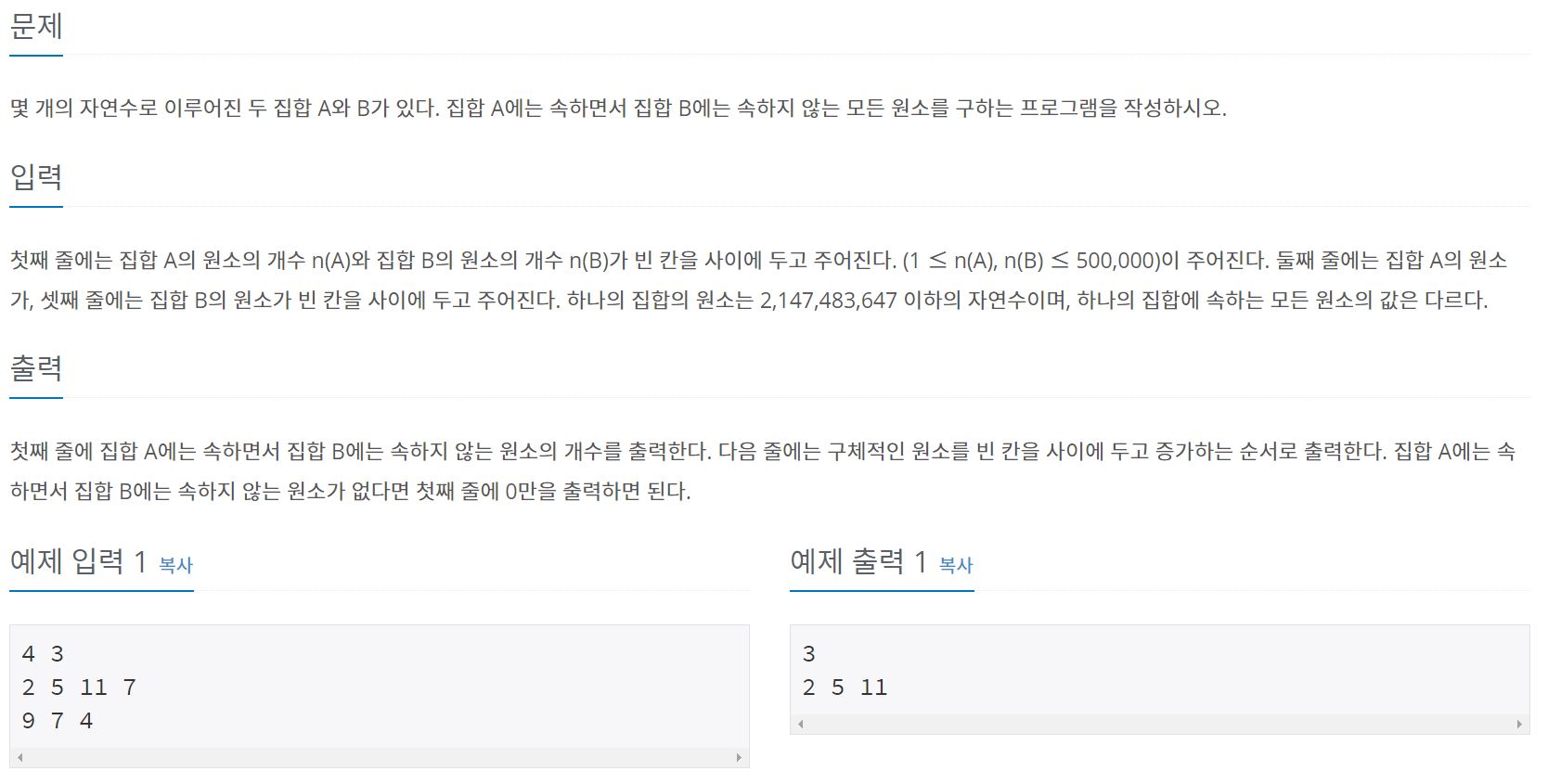 A의 원소 중 B의 원소가 아닌 것의 개수와 구체적인 원소를 출력하는 알고리즘을 구현하는 것이 목표이다.