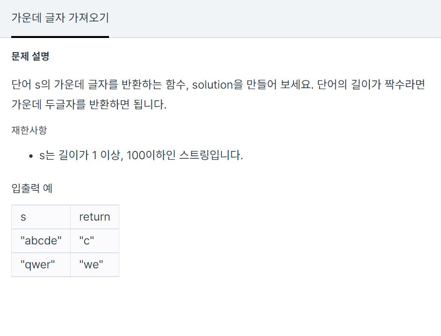코딩테스트 연습 - 가운데 글자 가져오기 | 프로그래머스 (programmers.co.kr)
