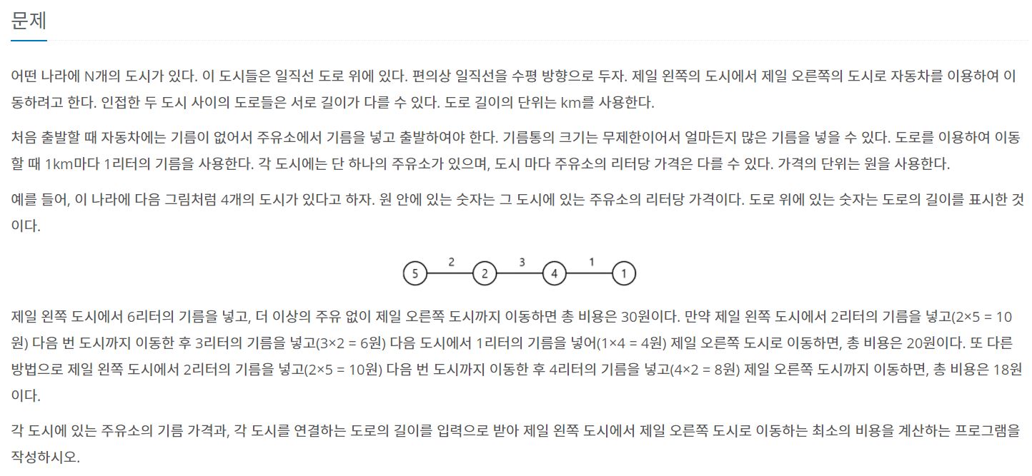 이 문제는 해당 지점에서 다음 기름값이 더 싼지, 비싼지를 선택해 나가며 최소비용을 구해야 한다.