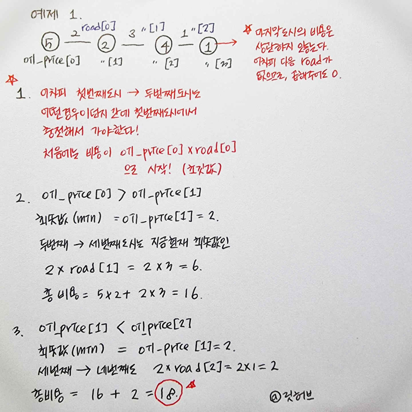 이후, 최소 기름값은 첫 도시의 기름값(oil_price[0])으로 초기화 해주고,