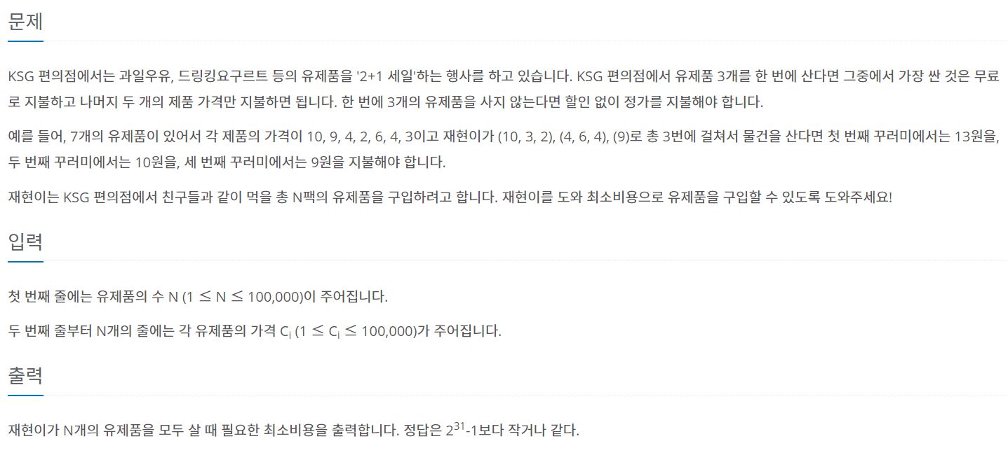[C++] 백준 11508번 2+1 세일 본문