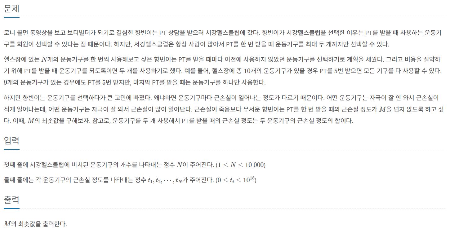 향빈이는 PT를 받을 때, 근손실정도가 최소가되도록 최대 하루에 2개씩 운동기구를 사용하려고 한다.