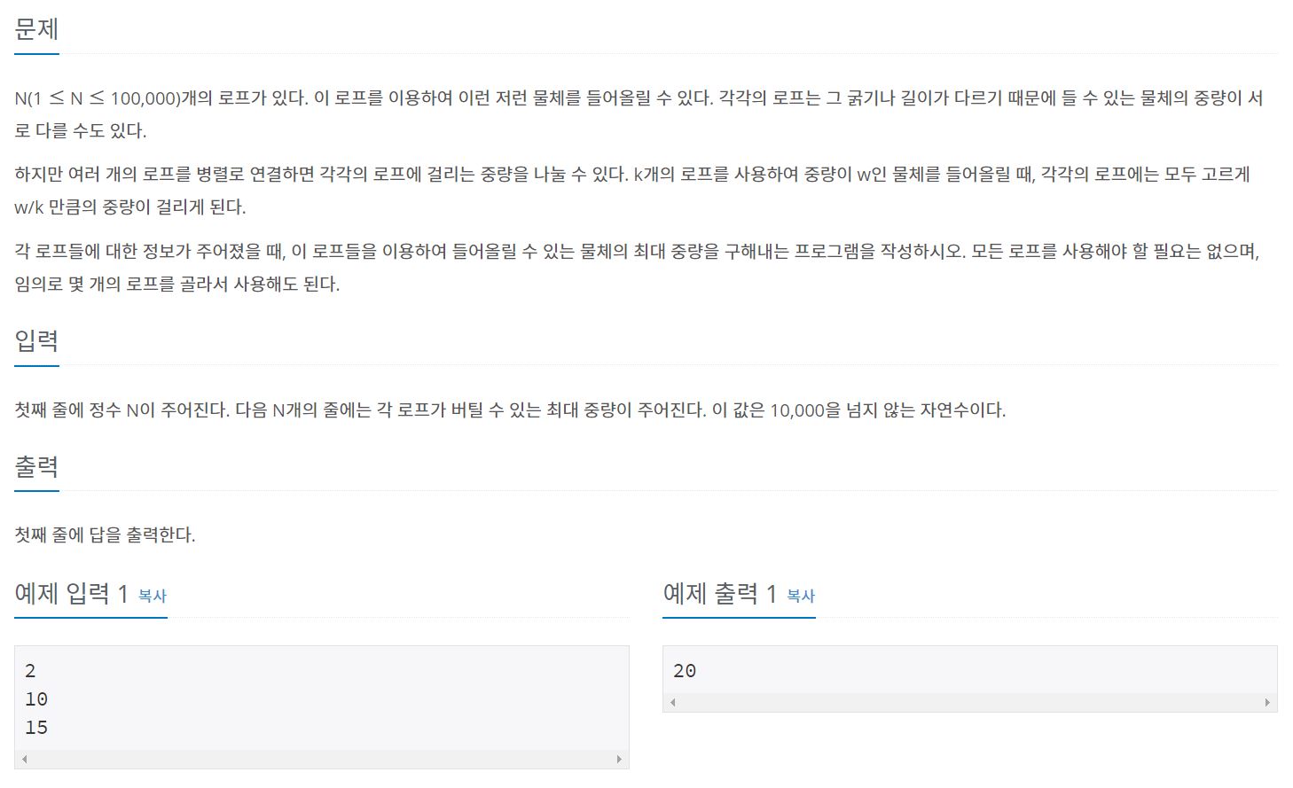 N(1 ≤ N ≤ 100,000)개의 로프가 있다. 이 로프를 이용하여 이런 저런 물체를 들어올릴 수 있다. 각각의 로프는 그 굵기나 길이가 다르기 때문에 들 수 있는 물체의 중량이 서로 다를 수도 있다. 하