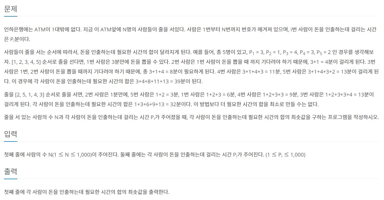해당 문제에서는 각 사람들이 돈을 인출하는데 필요한 시간의 합의 최소값을 구하는 것이 목표이다.