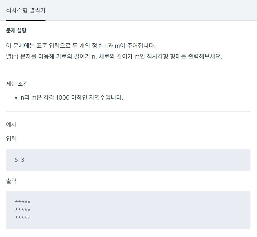 이 문제에는 표준 입력으로 두 개의 정수 n과 m이 주어집니다. 별(*) 문자를 이용해 가로의 길이가 n, 세로의 길이가 m인 직사각형 형태를 출력해보세요. 제한 조건 n과 m은 각각 1000 이하인 자연수