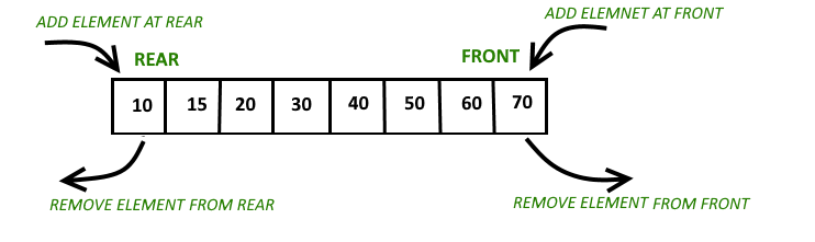 위 구조에서 볼 수 있듯이, 덱은 양쪽 끝(front, rear/back)에서 삽입과 삭제가 가능하다.