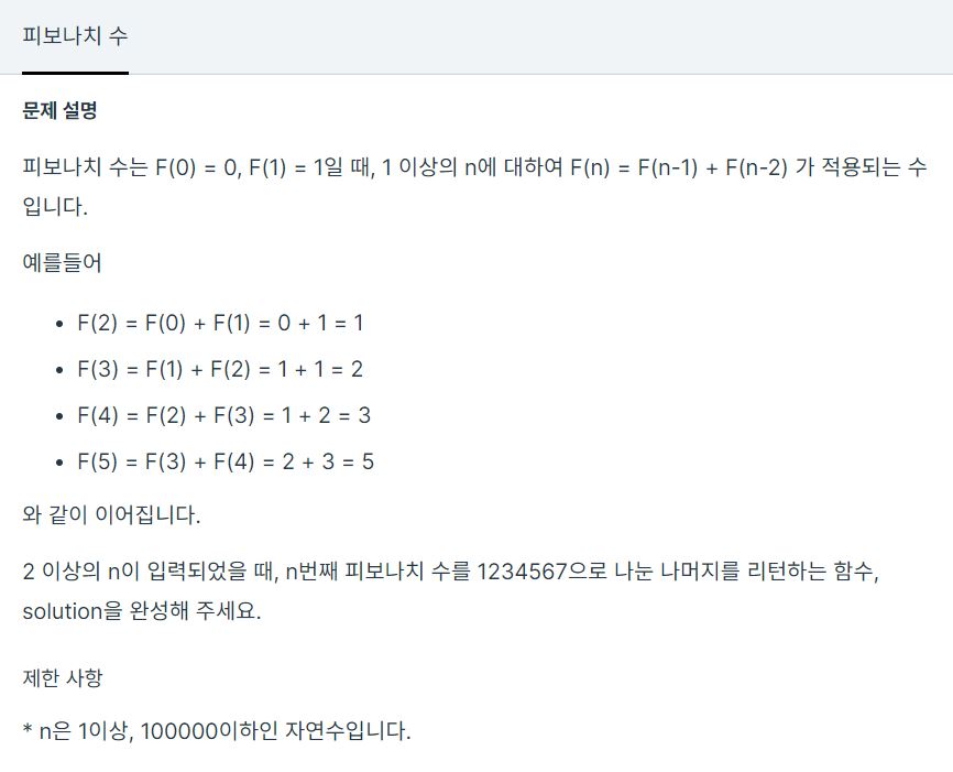 N번째 피보나치 수를 1234567로 나눈 나머지 값을 리턴하는 것이 목표이다.