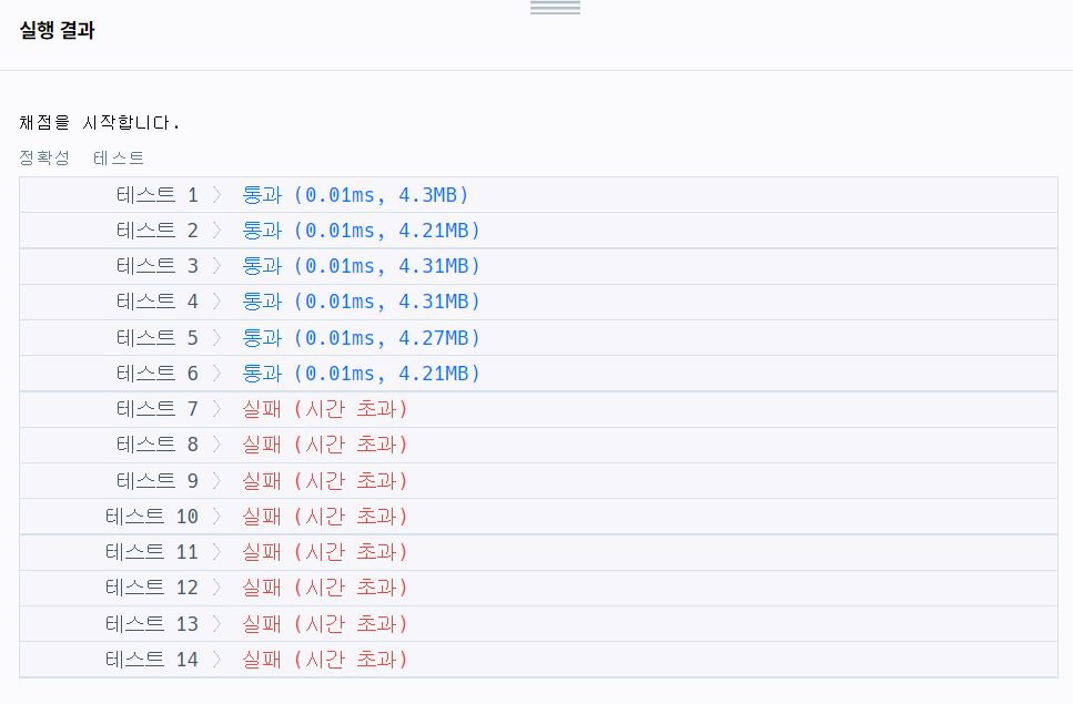 재귀를 통해 구현한 결과, 7번째부터 위와 같은 시간초과로 인한 실패를 마주하게 되었다.