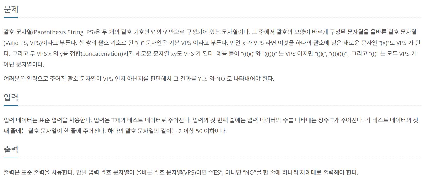 괄호 문자열(Parenthesis String, PS)은 두 개의 괄호 기호인 ‘(’ 와 ‘)’ 만으로 구성되어 있는 문자열이다. 그 중에서 괄호의 모양이 바르게 구성된 문자열을 올바른 괄호 문자열(Valid PS, VPS)이라고