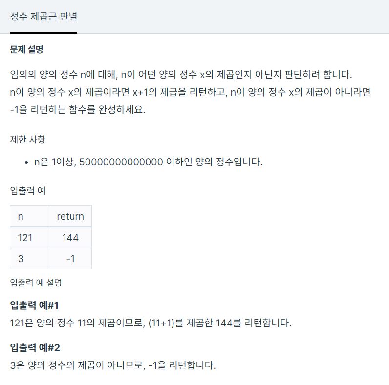 임의의 양의 정수 n에 대해, n이 어떤 양의 정수 x의 제곱인지 아닌지 판단하려 합니다. n이 양의 정수 x의 제곱이라면 x+1의 제곱을 리턴하고, n이 양의 정수 x의 제곱이 아니라면 -1을 리턴하는 함