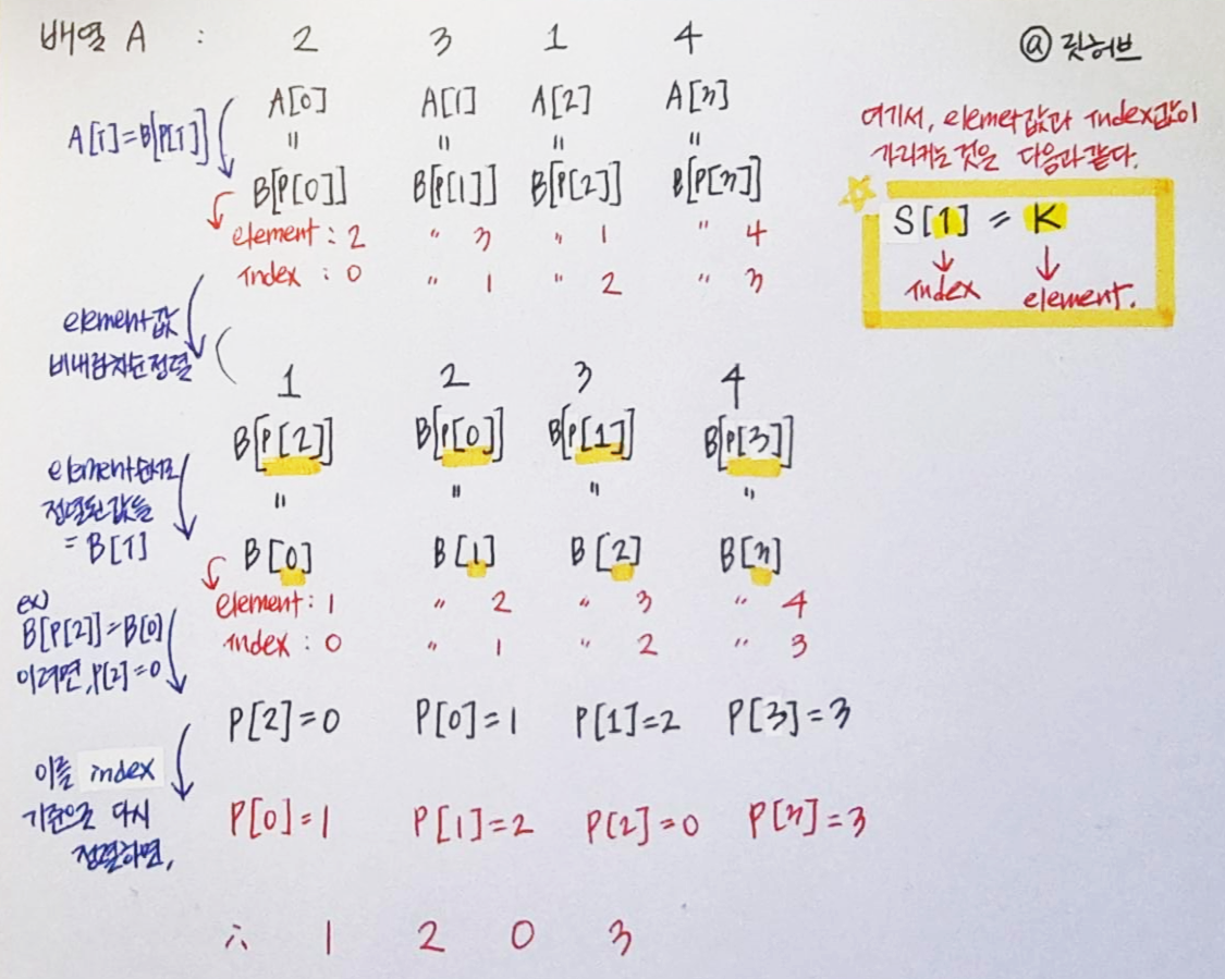 (P[i]의 element = B[i]의 index, P[i]의 index = B[P[i]]의 index 저장)