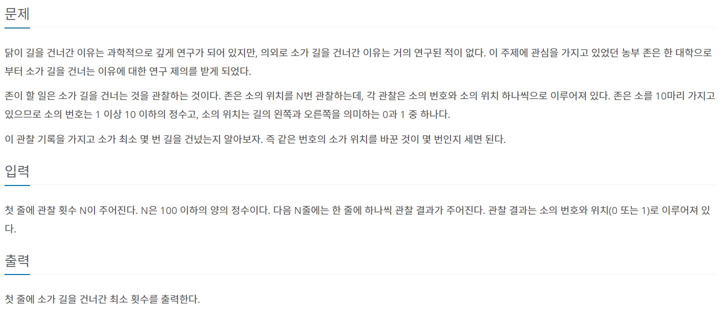 [C] 백준 14467번 소가 길을 건너간 이유 1 본문