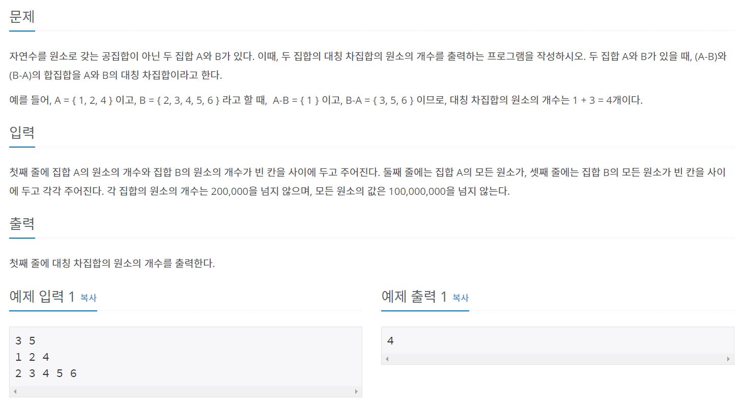 집합 A와 B가 주어질 때, 대칭 차집합의 원소의 개수를 출력하는 것이 목표이다.